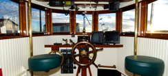 From a comfort and safety side we replaced the old engine with a new 130 h.p. Lugger. Wesmar roll-fin stabilizers were installed to improve the ride for both charter and pleasure voyages. The galley, salon and pilothouse were completely rebuilt, and new electronics, charts and additional navigational aids were added to ensure confident navigation of the Inside Passage (which we’ve done eight times now).